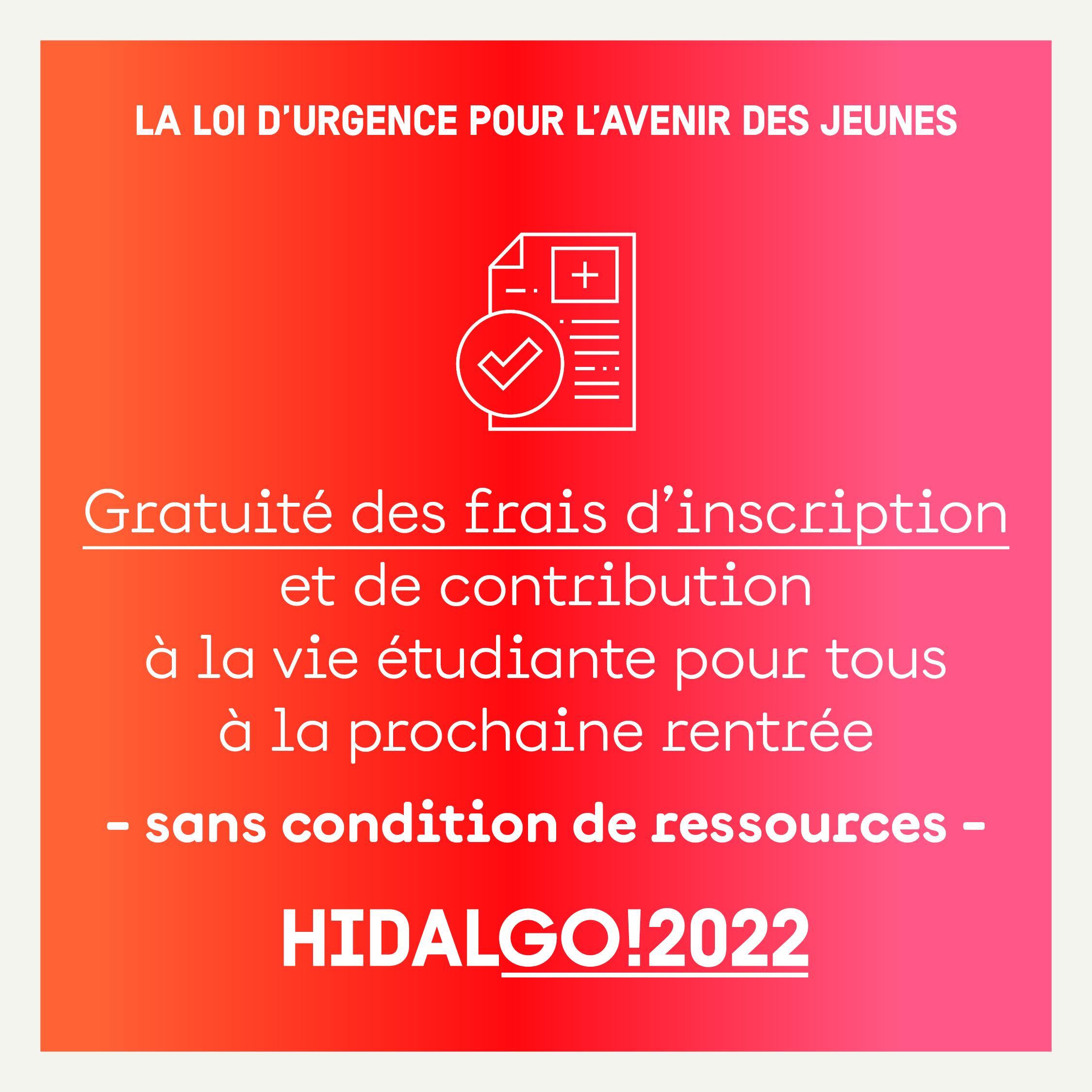 - Suppression des droits d’inscription dans toutes les universités et pour toutes les formations initiales qui sont encore payantes, dès la rentrée 2022.