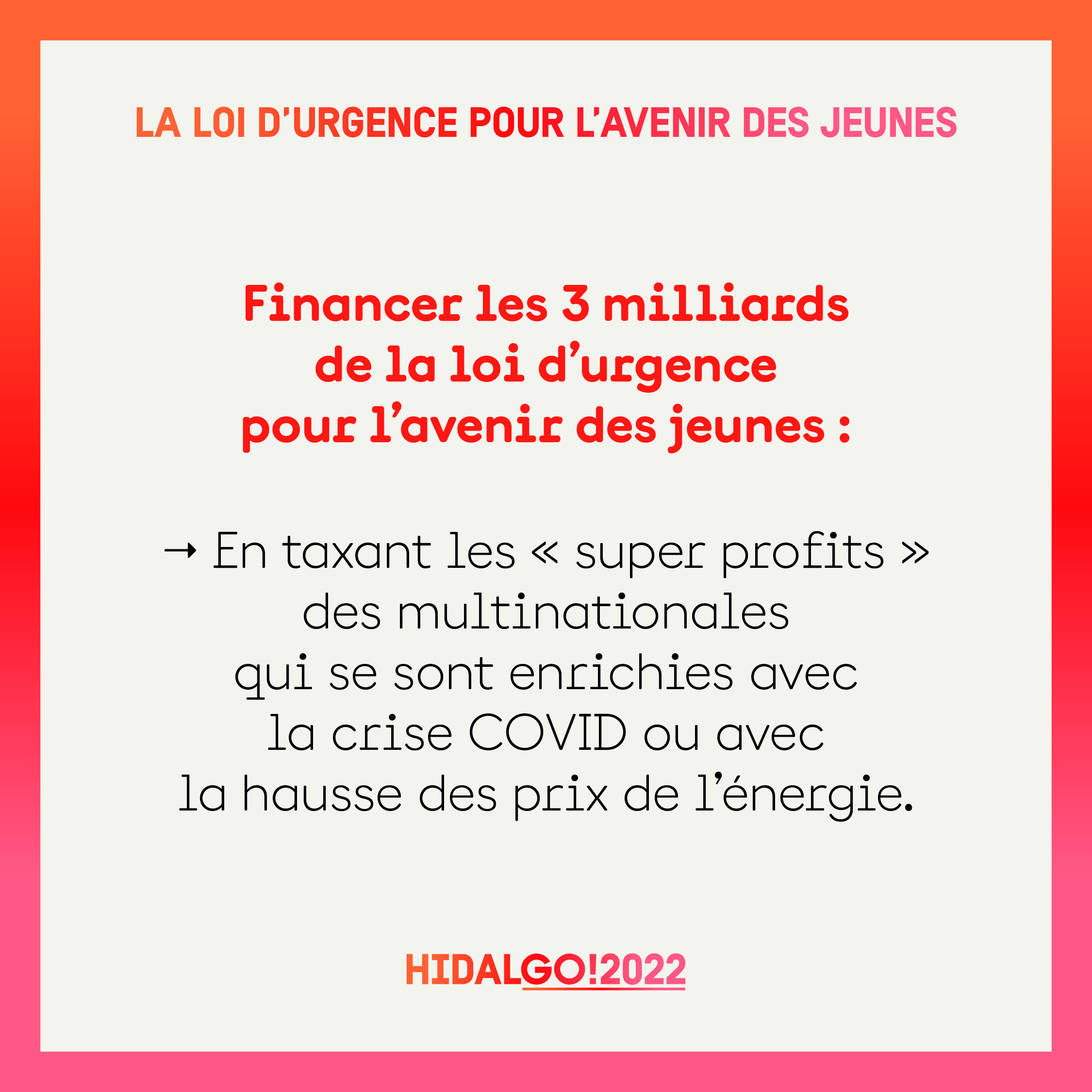 Les grandes entreprises font des profits record, alors même que nous vivons des crises qui dégradent les conditions de vie de nombreux Français et notamment des jeunes. Pour qu’ils soient justement redistribués, nous taxerons les surprofits réalisés grâce à la crise sanitaire et à la hausse des prix de l’énergie.