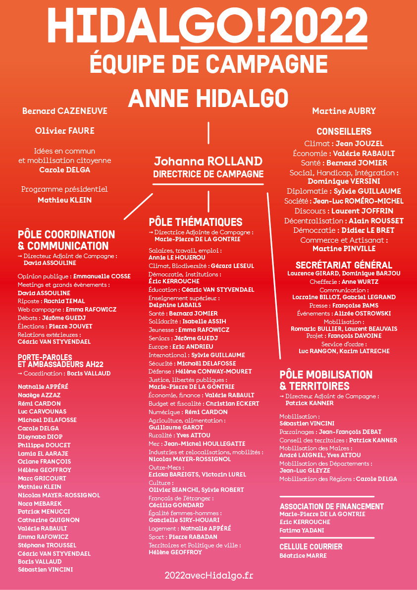 Convaincue de l’importance des territoires, Anne Hidalgo a souhaité s’entourer d’une équipe de femmes et d’hommes engagés, une équipe des maires et des élus des régions et des départements.