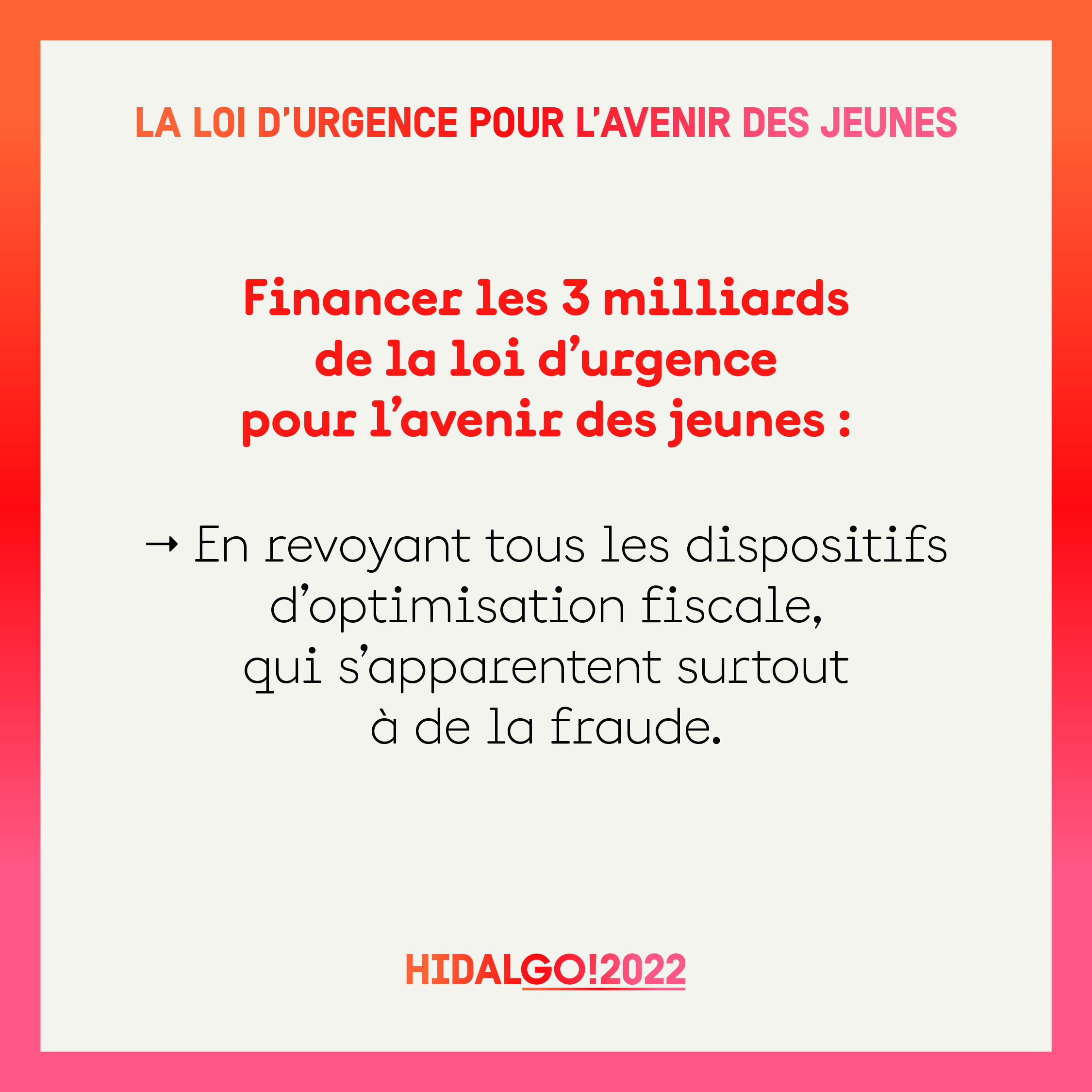 - Nous reverrons tous les dispositifs d’optimisation fiscale, pour récupérer tous les manques à gagner qui en résultent pour l’Etat et qui s’apparentent en réalité à de la fraude fiscale.